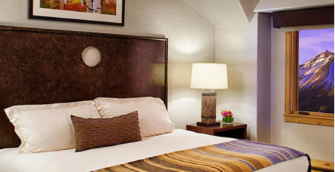 Alpine Vista hotel rooms at the Peaks Resort & Spa offer views of Mountain Village, Sunset Vista rooms provide more prominent mountain views. Both room types are 400 square feet. Units typically feature either a single king bed with a queen sofa sleeper or two king beds.