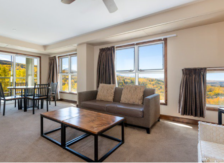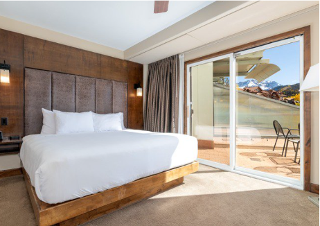 The Alpenglow Junior Suite is a spacious, studio-style suite with large windows and a private balcony overlooking the golf course and mountains. It's a popular choice for guests seeking enhanced comfort and impressive vistas during their stay. Units are approximately 620 square feet in size; they feature a king bed in the bedroom plus a queen sleeper sofa in the living area. Units are mostly "open floor plan" without a private bedroom; King Bed area is semi-private, separated from the living area with a single wall.